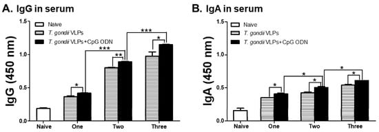 To determine whether the CpG-ODN adjuvant can enhance the efficacy of the T. gondii VLP vaccine after multiple immunizations, mice were immunized with either T. gondii VLPs alone or CpG-ODN-adjuvanted T. gondii VLPs for one, two, or three times. As expected, CpG-ODN-adjuvanted T. gondii VLP vaccination induced higher levels of T. gondii-specific IgG (Figure 1A) and IgA (Figure 1B) antibodies compared with unadjuvanted T. gondii VLPs upon one, two, and three immunizations. A positive correlation between antibody inductions and the number of immunizations was observed as anticipated. The highest IgG and IgA responses were observed from the sera of mice immunized thrice, while the lowest antibody inductions were found in mice immunized once. Notably, regardless of the vaccination schedule, the presence of CpG-ODN adjuvants effectively bolstered the serum antibody responses.