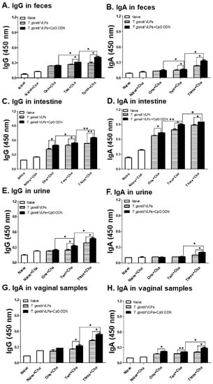 T. gondii-specific antibody and cytokine levels were determined by ELISA as reported previously [18,26]. Diluted immune sera (1:100), urine (1:3), vaginal samples (1:3), fecal supernatants (1:3), intestine samples (1:100), and brain supernatants (undiluted) were used as primary antibodies. Briefly, 96-well plates were coated with T. gondii RH (2 μg/mL) and blocked prior to incubation with the primary antibodies listed above. Anti-mouse IgG and IgA secondary antibodies conjugated with horseradish peroxidase (HRP) were used to detect the antigen-specific responses. The production of pro-inflammatory cytokines interferon-gamma (IFN-γ) and interleukin-6 (IL-6) were measured from the brain supernatants using the cytokine ELISA kits (BD Biosciences, San Jose, CA, USA).