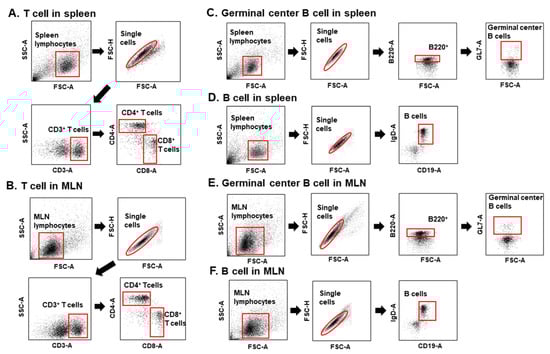 The gating strategy of CD4+ T cells, CD8+ T cells, and B cells in spleen and mesenteric lymph nodes (MLNs). Spleen and MLN cells from mice (n = 6) were collected at 35 dpi upon challenge infection with T. gondii ME49 and stained with phenotype-specific antibodies (CD3, CD4, CD8, B220, and GL7). The gating strategies depicted above were applied to identify CD4+ and CD8+ T cells (A,B), germinal center B cells, and B cells from both spleen and MLNs (C–F).