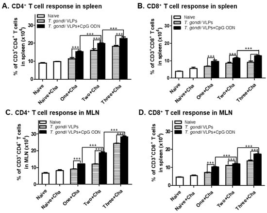 Immunization with CpG-ODN-adjuvanted T. gondii VLPs enhances CD4+ (A,C) and CD8+ (B,D) T-cell frequencies. BALB/c mice (n = 6 per group) immunized one, two, or three times were challenge-infected with T. gondii ME49, 4 weeks after the last immunization. Spleen and MLN tissues were harvested at 35 dpi and then cell phenotypes were determined by flow cytometry with or without T. gondii antigen stimulation. Results are presented as mean ± SD and statistical significances were denoted using asterisks (*** p < 0.001).