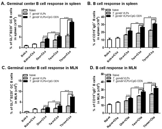 Immunization with the adjuvanted T. gondii VLPs enhances antigen-specific B-cell responses. Immunized mice (n = 6 per group) were infected with T. gondii ME49, 4 weeks after the last immunization. Spleen and MLN tissues were harvested at 35 dpi and then cell phenotypes were determined by flow cytometry. The percentage of GC B (A,C) cells or B cells (B,D) was quantified by subtracting unstimulated cells from stimulated cells. Results are presented as mean ± SD and statistical significances were denoted using asterisks (** p < 0.01 and *** p < 0.001).
