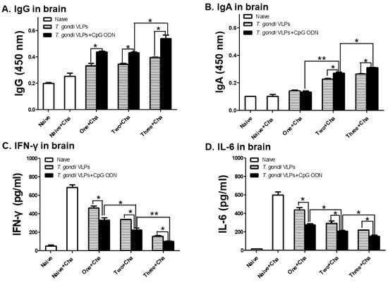 Antibody responses and pro-inflammatory cytokine responses in the brain upon one, two, and three immunizations. Mice (n = 6 per group) were immunized once, twice, or thrice with either adjuvanted or unadjuvanted T. gondii VLPs, and their brains were collected at 35 dpi with T. gondii. Brain supernatants were prepared and pro-inflammatory cytokines were measured by ELISA. Results (A–D) are presented as mean ± SD and statistical significances were denoted using asterisks (* p < 0.05 and ** p < 0.01).