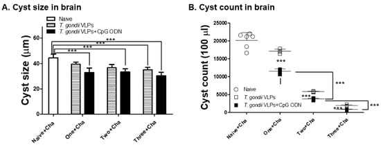 To further assess the effects of T. gondii VLPs formulated with CpG-ODN adjuvants, key parameters indicating protection such as cyst size and their counts in the brain were measured. Different groups of mice received a different number of immunizations with or without CpG-ODN adjuvants. Upon challenge infection, mice were sacrificed at 35 dpi to evaluate reductions in brain cyst size and their counts under the microscope. Cyst sizes observed from the brains of mice immunized once, twice, or thrice were 35.1 μm, 35.6 μm, and 30.3 μm, respectively (Figure 7A). Compared with the cysts observed from unimmunized control (44.8 μm), significant reductions in cyst sizes were detected from immunized mice which were unaffected by adjuvants. Cyst formation was suppressed to a greater extent in mice immunized with T. gondii VLPs formulated with CpG-ODN adjuvants than those receiving T. gondii VLPs alone (Figure 7B). Cyst counts from immunization with T. gondii VLPs alone once, twice, or thrice were 17,100, 5870, and 2010, respectively. Immunization with adjuvant-formulated VLPs once, twice, or thrice further lessened these counts to 13,400, 3750, and 807, respectively. These results indicated that adjuvant usage and multiple immunizations have a profound effect on reducing total cyst counts.