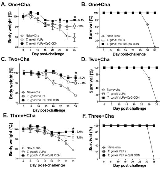 Protective efficacy induced by T. gondii VLPs alone and adjuvanted T. gondii VLPs following multiple immunizations. Immunized mice (n = 6 per group) were challenge-infected after the final immunization and monitored for 35 days. Bodyweight reductions (A,C,E) and survival rates (B,D,F) from mice immunized once, twice, or thrice were measured during this period. Results are presented as mean ± SD and statistical significances were denoted using asterisks (* p < 0.05).