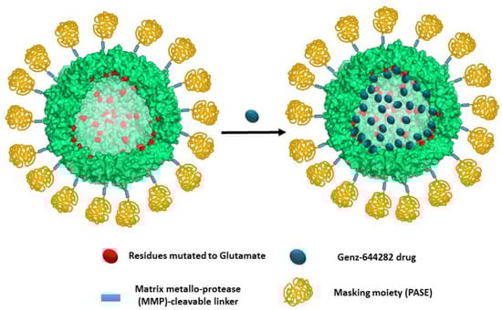 Schematic representation of The-0504. The Lys53, Lys71, Thr135 and Lys143 residues are mutated to Glutamate (Glu) in the The-05 protein (left). Mutated residues are colored red. Metalloprotease cleavable sequence and PASE polypeptide are colored light blue and gold, respectively. Genz-644282 drug is colored blue. All other residues are light green. To allow the internal surface of the protein to be visualized (lighter colors), only 18 monomers are shown. The picture has been generated with PyMol.