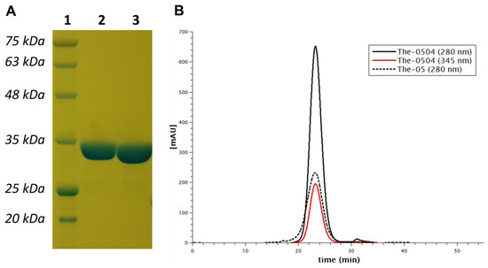 Purity of the The-05 nanocarrier before and after Genz-644282 encapsulation. (A) SDS-PAGE band migration profiles: Lane 1, protein marker; Lane 2, The-05 (10 µg); Lane 3, The-0504 (10 µg). (B) Size-exclusion chromatography analysis of The-05 and The-0504 detecting simultaneously The-05 protein and Genz-644282 contributions at 280 nm (black) and 345 nm (red), respectively.