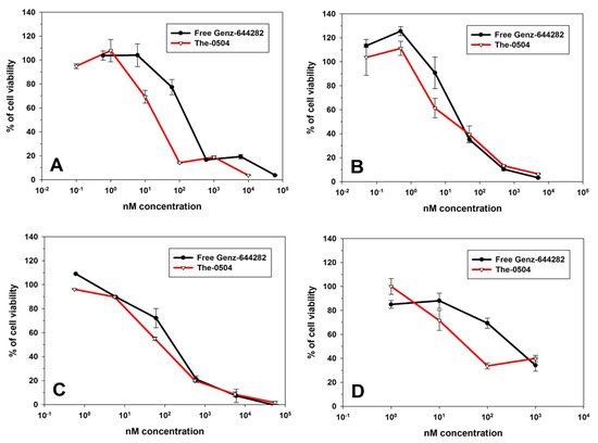 Human colorectal (HT29) and pancreatic (MiaPaCa2 and HPAF II) cells were obtained from American Type Culture Collection (Manassasas, VA, US); PaCa44 cells were kindly provided by Prof. A. Scarpa (Verona University, Verona, Italy).Cancer cells were passaged every 4 days using RPMI Medium. Media was supplemented with 2 mM glutamine, 10% of FBS and antibiotics. To perform the in vitro proliferation assays 5 × 103 cells per well were plated in 96-well culture microplates. After overnight incubation, cells were treated in triplicate with 10 µL of serial dilutions of free Genz-644282 or The-0504 for 72 h. Then, the medium was replaced with fresh medium w/o phenol red supplemented with XTT (2,3-Bis-(2-Methoxy-4-Nitro-5-Sulfophenyl)-2H-Tetrazolium-5-Carboxanilide) reagent (Sigma-Aldrich, St Louis, MO, USA), according to manufacturer’s instructions. Finally, cells were incubated at 37 °C and the developed staining measured at 450 nm by a microplate reader (VERSAmax, Molecular Devices, Sunnyvale, CA, USA). The percentage of cell viability was estimated by comparing cells treated with free Genz-644282 or The-0504 to mock treated cells.
