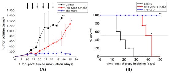 In vivo efficacy. (A) Tumor-growth curves for each mouse group are indicated. Student’s t-test is used to determine statistical significance. Control vs The-0504 and Control vs Free Genz-644282: ** p < 0.005; Free Genz-644282 vs The-0504: * p < 0.05. (B) Survival curves of different animal groups. Mice were sacrificed when the tumor had reached a volume in the range 1000–1500 mm3. Statistical analysis was performed by log-rank test. Control vs The-0504, and Control vs Free Genz-644282: ** p < 0.005; Free Genz-644282 vs The-0504 mg/Kg: * p < 0.05.