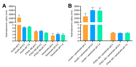 Hydrodynamic radii according to volume distributions at pH 5, 6.5, and 7.4 determined by dynamic light scattering. (A): 180 µM insulin, 180 µM PTH(1-34), or 720 µM penetratin. (B): 180 µM insulin or 180 µM PTH(1-34) in physical mixture with 720 µM penetratin. Data are presented as volume mean sizes (N = 3, mean ± SD).