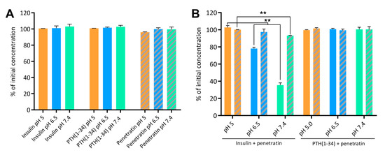Insulin, PTH(1-34), and penetratin left in the supernatant following ultracentrifugation alone (A) or as physical mixtures of insulin and penetratin or PTH(1-34) and penetratin (B) at pH 5, 6.5, or 7.4. Full columns represent insulin or PTH(1-34) and dashed columns represent penetratin. Data are presented as % of initial concentration (N = 2, mean ± SD). Level of significance is **: p < 0.01 (unpaired t-test).