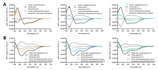 The biologically active forms of insulin [20] and PTH(1-34) [21] adapt well-defined secondary structures. In addition, the ability of penetratin to adapt into an alpha helical conformation in the vicinity of lipid membranes [3,22] may be important for its membrane permeating potential [23,24]. Therefore, the effect of complexation on the secondary folding propensity was studied using CD spectroscopy (Figure 3). Alone in solution, the secondary structure of insulin, PTH(1-34), and penetratin was not affected by the sample pH (Figure S2). Insulin (Figure S2A) and PTH(1-34) (Figure S2B) adapted into well-defined α-helical structures as evident by the characteristic minima and maximum observed at 208/222 nm and 193 nm, respectively. Penetratin alone did not adapt into a well-defined secondary structure (Figure S2C).