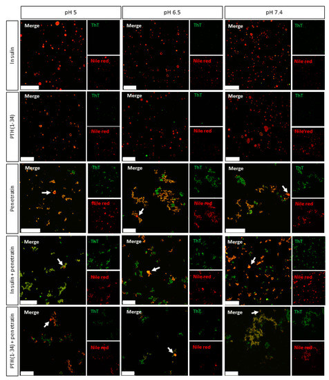 The ability of penetratin to interact with/disrupt liposomal structures, alone or in mixture with insulin or PTH(1-34), were studied using fluorescence confocal microscopy (Figure 4). POPC:POPG liposomes were included as membrane mimics. ThT and Nile Red, having affinity for amyloid fibrils and hydrophobic patches, respectively [25,26], were included for visualization of self-associated molecules, insulin/PTH(1-34)-penetratin complexes, and lipid structures.