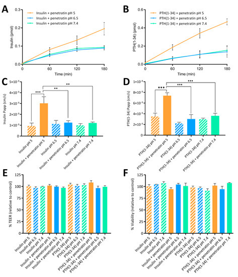 Permeation of insulin (A) or PTH(1-34) (B) across Caco-2 monolayers following application of 5 µM insulin or 5 µM PTH(1-34) in physical mixture with 20 µM penetratin at pH 5, 6.5, or 7.4 for 3 h. The apparent permeability coefficient (Papp) determined after application of 5 µM insulin (C) or PTH(1-34) (D) administered alone or in physical mixture with 20 µM penetratin at pH 5, 6.5, or 7.4. Apparent permeability (Papp) calculations are based on data from all time-points. TEER (E) and cell viability (F) evaluated following application of insulin or PTH(1-34) alone or in physical mixture with 20 µM penetratin at pH 5, 6.5, or 7.4 (N = 3, n = 3, mean ± SEM). Levels of significance are **: p < 0.01 and ***: p < 0.001 (one-way ANOVA with Tukey’s multiple comparisons test).