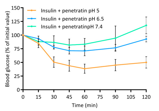 Blood glucose level depicted as % of initial value following intraintestinal administration of insulin (50 IU/kg) in physical mixture with 720 µM penetratin corresponding to a molar 1:4 ratio at pH 5, 6.5, or 7.4. Data are presented as % of initial value (N = 6, mean ± SD).