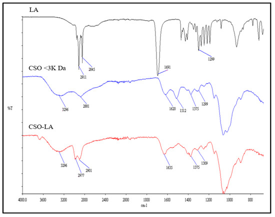 FTIR spectra of lauric acid (LA), chitosan oligomer (CSO), and chitosan oligomer-lauric acid (CSO-LA).