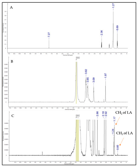 Proton nuclear magnetic resonance spectroscopy (1H NMR) analysis was performed for the CSO-LA, CSO, and LA samples in order to confirm the presence of fatty acid chains in the chitosan conjugate. A total of 5 mg of CSO-LA, CSO, and LA was dissolved individually in 1 mL of deuterium oxide (D2O) with the addition of one drop of acetic acid-d4 (for the chitosan-based sample only). The 1H NMR spectra were obtained using an NMR Bruker Avance 500 spectrometer (Bruker Instruments, Billerica, MA, USA).