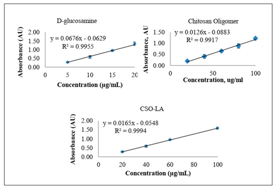 Absorbance versus concentration plots from the ninhydrin assay of d-glucosamine, CSO, and CSO-LA (n = 3, mean ± SD).
