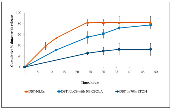 From the HPLC analysis, the linear regression of the dutasteride data showed a good linearity ranging from 3 to 100 μg/mL. The limit of detection (LOD) and limit of quantification (LOQ) were 0.38 and 3 μg/mL, respectively. The release profiles of both nanoparticle formulations are shown in Figure 6, with a faster drug release exhibited by uncoated DST-NLCs (p < 0.05). DST-NLCs without coating showed an approximately 80% drug release at 24 h, while nanoparticles coated with CSO-LA released 55% over the same time period. The presence of the polymer in the outer regions of the DST-NLCs coated with CSO-LA significantly reduced the amount of drug released (p < 0.05) at 12, 24, and 30 h. Dutasteride in ethanolic solution shows the slowest drug release. This could be due to the limited dutasteride solubility in the receptor medium [37].