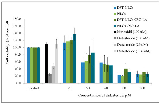 Cytotoxicity of dutasteride alone, empty NLCs/NLCs-CSO-LA, and DST-NLCs coated and uncoated with 5% CSO-LA on the hair follicle dermal papilla cells after 5 days (n = 4, mean ± SD). The amount of dutasteride in the NLCs corresponds with that of the pure drug.