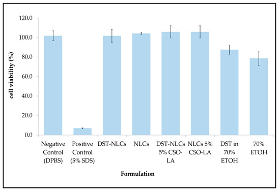 Table 4 compares the properties of DST-NLCs and NLC coated with 5% CSO-LA and 5% CSO-SA. The data for NLCs coated with CSO-SA was previously reported by us [33] in a paper which used a Design of Experiments approach to optimise DST-NLCs in order to achieve a small mean particle size, narrow PDI, and high drug entrapment efficiency. In the current paper, a DST-NLC system coated with 5% CSO-LA was prepared and characterised, then further studied in terms of the in vitro performance with a focus on cytotoxicity, skin irritation, and cell and skin uptake.