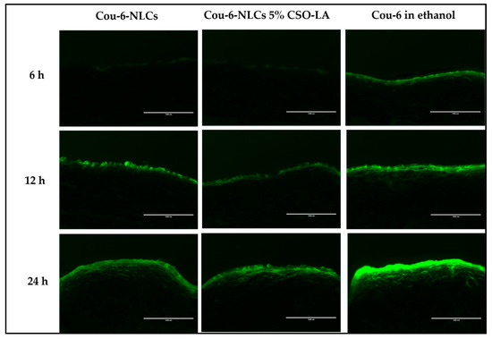 In this experiment, Cou-6 was used in the NLCs, with a comparable amount of Cou-6 (0.003 mg/mL) diluted as a control with 70% ethanol. The Franz diffusion cell set-up was identical to the research on permeation, as outlined above. The pig ear skin was placed into Franz diffusion tubes, and uncoated or coated with CSO-LA Cou-6 NLC formulation was pipetted into the donor chamber. The skin was removed every 6, 12, and 24 h. The removed skin was further frozen at −30 °C in a Leica CM1850 cryostat (Leica Microsystems, Wetzlar, Germany) before being fitted to the cryostat chuck using the compound OCT (optimum temperature cutting) (VWR International Ltd., Belfast, UK). The skin was cryotomed at a thickness of 50 μm at −30 °C and the skin slices were transferred directly to microscope adhesion slides (Adhesion slides, SuperFrost Plus, VWR, Belfast, UK) and visualised using an inverted fluorescence microscope (EVOS ™ FL Imaging System, Life Technologies, Carlsbad, CA, USA) with a EVOS ™ DAPI (4′,6-diamidino-2-phenylindole) light cube filter without extracting the stratum corneum.
