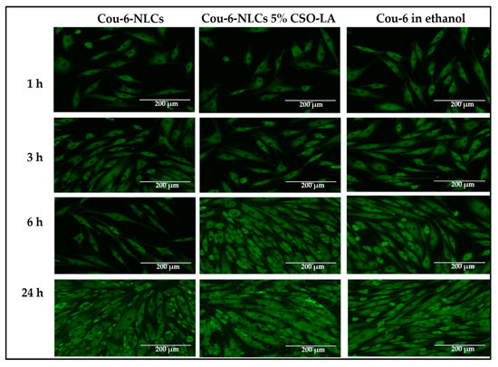Figure 10 indicates the absorption of Cou-6 in ethanolic solution and NLCs in the dermal papilla cells of hair follicles at different time points. The dye could not be quantified using HPLC or a UV spectrophotometer (lower than LOQ) due to the small amount of Cou-6 taken up by the cells. There was a similar pattern in the cell uptake as for the skin uptake (Section 3.7), with Cou-6 being taken up in a time-dependent manner in all formulations. There was no large difference in the fluorescence dye intensity within cells from the solution or nanoparticles. At the latest time point, the level was highest for all formulations, suggesting that the cells took up Cou-6. Considering the near proximity of the Log P values of Cou-6 and dutasteride, Cou-6 can be considered a good model for studying the cell absorption of these systems.