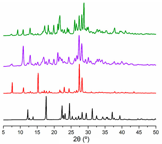 The salt H2Mf(HpOXA)2∙4W exhibits a sequence of two weight losses at peak temperatures of 65 °C and 113 °C as endothermic processes, that correspond to the release of one (exp. 2.6%, calcd. 2.7%) and three water molecules (exp. 7.8%, calcd. 8.1%) per formula unit, respectively; Figure 6. The remaining solid is stable between 150 and 200 °C and decomposes at a peak temperature of 212–214 °C, releasing the equivalent to 53% of the initial mass; Figure 6. Thus, a new microcrystalline phase of composition H2Mf(HpOXA)2 was obtained after air drying at 100 °C, this anhydrate rehydrates into the original tetrahydrate under 100% RH at 40 °C. The XRPD patterns that confirm the crystallinity and change in the solid phases are shown in Figure 7.