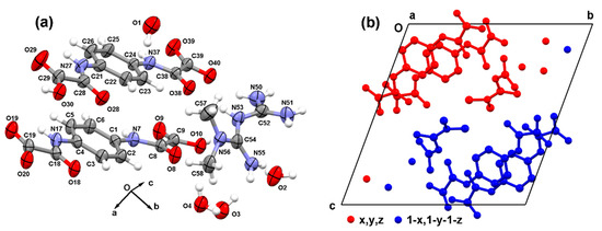 The salt H2Mf(HpOXA)2∙4W crystallizes in the triclinic system, space group P-1 with one, two and four independent units of H2Mf2+, HpOXA− and H2O in the asymmetric unit, respectively, and whose molecular structure is depicted in Figure 2.