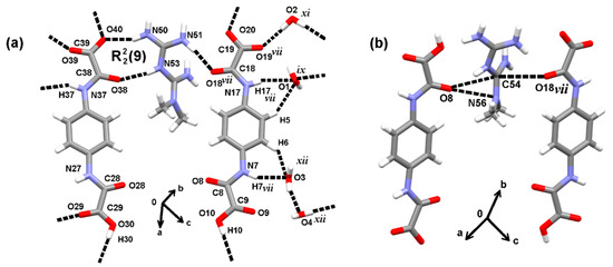 Furthermore, the protonation of the nitrogen bridge, in dicationic metformin, avoids the formation of the homodimer R22(8), raised by N–H∙∙∙N interactions. This motif is frequently observed in the crystal structures of the monocationic metformin salts but absent in all dicationic known salts of metformin [6] including the tetrachlorocuprate [38]. Instead, a hydrogen bonding heterodimer Rad(n) is formed in dicationic salts, with the participation of the anion group: R22(8) in the oxalic acid [30] and nitrate [39], R22(9) in squarate [40] and oxalamate monoacid (this work), R33(12) motif in sulfate [30] and R22(16) in sulfonatocalix [4,5]arenes [41]. The conformation in the form of an S backbone and the strongest acid on the nitrogen bridge seems to favor the hetero- over the homo-association. At this point, it is worth highlight the differences between metformin–carboxylate and metformin–oxalamate salts. The first forms the hydrogen bonding hetero-dimeric R22(8) motif, which has been found, in the crystal network of guanidinium–carboxylate synthons [9]. This dominant motif is absent in the oxalamate salt H2Mf(HpOXA)2∙4W. Instead, the amide carbonyl of the HpOXA− moiety participates in the formation of the observed R22(9) motif and in the n→π * charge-assisted interactions of mono- and bifacial type, herein described (see Table 2). Even when weak in strength, the n→π * interaction, also named π-hole, has been found to be important for the stability of biomolecules and materials [42]. Because of the nature and bonding of the atoms involved, the carbonyl–guanidinium synthon CO∙∙∙CN+ is similar to CO···CO interactions [32], but charge assisted. This synthon, as well as H2O∙∙∙CN+ synthon, is present, even when not described in the original sources, in the crystal network of metformin dicationic salts of squarate and oxalate. The analogous synthon SO∙∙∙CN was identified in the crystal network of the acesulfame [43] and also in sulfonatocalix [4,5]arene metformin dicationic salts, in this last in the bifacial fashion SO∙∙∙CN+∙∙∙OS. Selected geometric parameters are listed in Table 6 to support the above discussion.