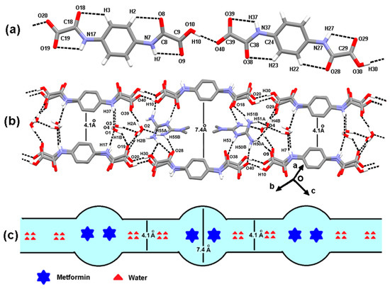 (a) Acid∙∙∙carboxylate hydrogen bonding between the two units of HpOXA−. (b) Double strands of H2Mf(HpOXA)2∙4W propagating along the (1 1 −1) plane. (c) Pictorial representation of H2Mf(HpOXA)2∙4W where metformin diammonium and water pockets are highlighted.