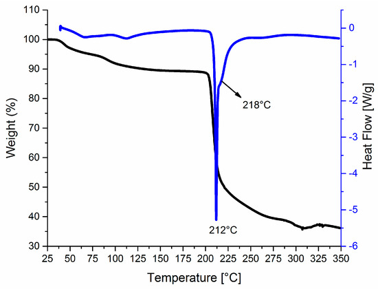 Tg, in black, and DSC, in blue, of H2Mf(HpOXA)2∙4W.