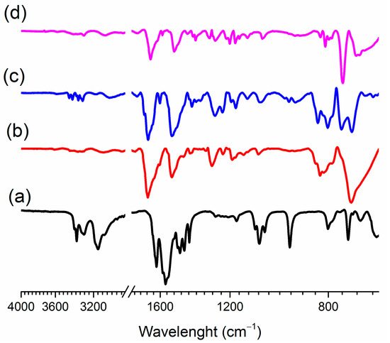 IR spectra of (a) metformin hydrochloride (HMfCl), (b) H2Mf(HpOXA)2∙4W, (c) H2Mf(HpOXA)2 and (d) H2Mf(HpOXA)2∙4W after rehydration from H2Mf(HpOXA)2.