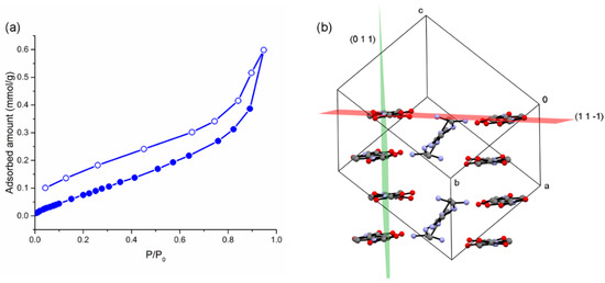 (a) Adsorption–desorption isotherm of H2Mf(HpOXA)2 under nitrogen, solid circles for adsorption and hollow circles for desorption. (b) View of the H2Mf(HpOXA)2∙4W planes, water molecules are omitted. The hydrogen bonding network is weakened in the (1 1 −1) family of planes by the loss of four water molecules, but hydrogen bonding and n→π * charge-assisted interactions prevail in the (0 1 1) family of planes.