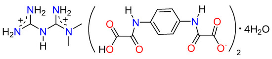 Metformin hydrochloride (HMetCl) was isolated from commercial sources: 10 tablets of 500 mg were ground and suspended in 150 mL of ethyl alcohol (96%), the mixture was boiled under stirring for 10 min or until complete dissolution. The hot solution was filtered; crystals of HMfCl were obtained after cooling to room temperature to obtain 2.5 g of a white solid, which was analyzed by IR, NMR and single crystal X-ray diffraction, corresponding to the crystal structure reported by Hariharan [7]. The N,N′-(1,4-phenylene)dioxalamic acid double hydrate (H2pOXA∙2W, W = water) was obtained as reported elsewhere [14]. Single crystals of N,N′-(1,4-phenylene)dioxalamate of di-(metformin diammonium) tetrahydrate (H2Mf(HpOXA)2∙4W) were harvested starting from 0.060 g (0.350 mmol) of HMfCl and 100 mg (0.347 mmol) H2pOXA∙2W which were grinded with a pestle in a mortar with the aid of few drops of water for 33–45 min until a homogeneous paste was formed. This mass was suspended in 40 mL of water and boiled under stirring until a clear solution appeared. The solution was left to stand at room temperature and after two days, 0.113 g (0.16 mmol) of beige crystals suitable for X-ray analysis were obtained in 92% yield. Similar results were obtained using 1:2 stoichiometric amounts of HMfCl (0.030 mg) to H2pOXA∙2W (100 mg) to obtain 0.120 g (0.17 mmol) of H2Mf(HpOXA)2∙4W in 98% yield. Microcrystalline powder of H2Mf(HpOXA)2 was obtained from single crystals of H2Mf(HpOXA)2∙4W after drying at 100 °C for 2 h in an air oven.