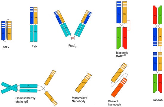 Non-endogenous polypeptides are also used clinically and are being widely evaluated in preclinical programs. Many different non-endogenous polypeptides have been described [13] such as designed ankyrin repeat proteins (DARPins), single-domain antibodies (e.g., nanobodies (VHH antibodies), domain antibodies, anticalins, avimers, adnectins and bispecifics such as bispecific T-cell engagers (BiTEs), tandem diabodies (TandAbs) and dual-affinity re-targeting antibodies (DARTs) [14] (Figure 1). Since many of these scaffolds have short serum half-lives, strategies to improve their pharmacokinetic properties are necessary [14].