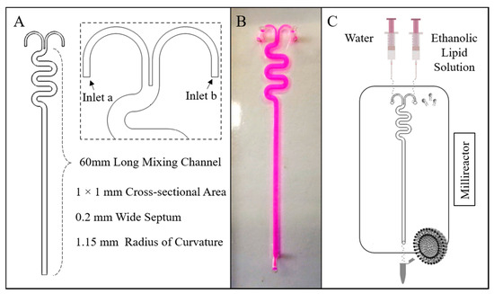 (A) The millireactor’s geometrical characteristics, (B) a top view photograph of the millireactor, and (C) a schematic illustration of the experimental approach for liposome production using the millireactor.
