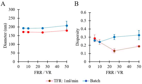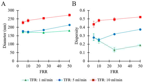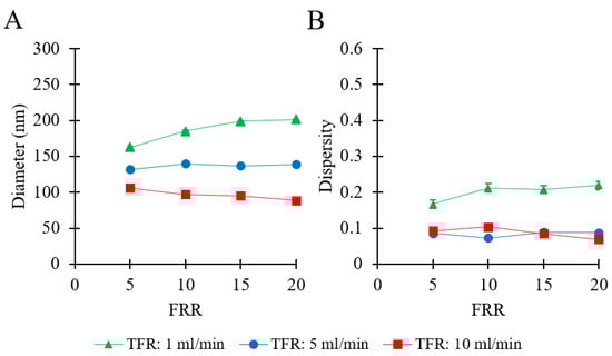 Effects of total flow rate (TFR) and flow rate ratio (FRR) on liposome Z-average size (A) and dispersity (B). Data represent the means of three measurements with corresponding standard deviations. Refer to Table 1 (batch code #27 DPPC to #38 DPPC) for the corresponding experimental conditions, lipid compositions, and numerical data of mean values and standard deviations.