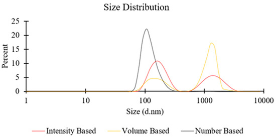 The liposome size distributions shown in Figure 4 were determined by taking into account the scattering intensity of each particle fraction. The peak observed at a particle size of ≈1000 nm in the intensity-based distribution potentially originated from aggregates or larger vesicles, since the particle’s scattering intensity is proportional to the square of the particle’s molecular weight. The number and volume-based distributions were instead derived from the intensity-based distributions using Mie theory. Whilst a peak at ≈1000 nm appeared in the volume-based distribution, it could not be detected in the number-based distribution; this was likely due to the fact that these larger particulate structures represent only a relatively small proportion of the overall number of particles in the dispersion [47,48].