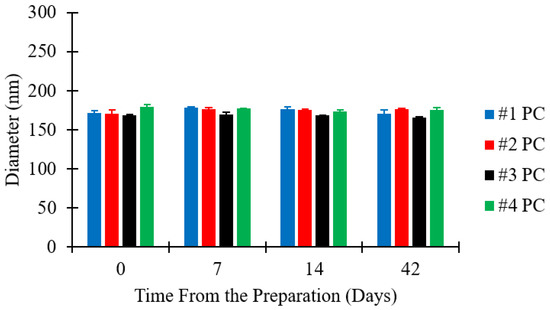 The storage stability of liposomes was assessed by analysing four different batches. Please refer to Table 1 (batch code #1 PC to #4 PC) for the corresponding experimental conditions and lipid composition. Samples were kept in glass vials at 4 °C for up to 42 days, and size measurements were taken on day 0 (just after production), day 7, day 14, and day 42. Changes in liposome size over time are reported in Figure 5.