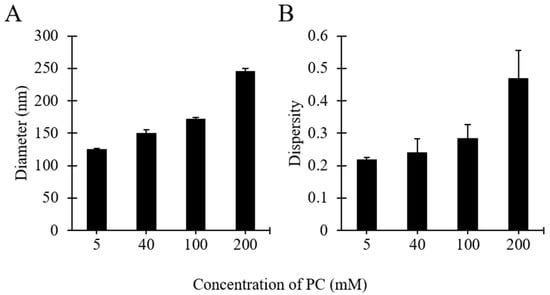 As shown in Figure 6, increasing PC concentration resulted in increases of liposome diameter and size dispersity. Specifically, when increasing the initial PC concentration from 5 to 200 mM the liposome diameter increased from 125 to 245 nm (Figure 6A), and the dispersity from 0.22 to 0.46 (Figure 6B). Both these increments were more pronounced at concentrations >100 mM. These findings confirm the observations reported above (see Figure 2), and are also consistent with other studies describing the production of liposomes by microfluidic approaches [23,56]. Increasing the initial concentration of lipids likely resulted in a greater number density of lipid molecules available to form supramolecular aggregates of larger size and broader size distribution.