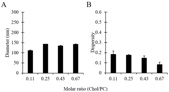 Effects of cholesterol concentration (in the molar range 1:9 to 1:1.5, at a total concentration of 16 mM) on liposome size (A) and dispersity (B). Data represent the means of three measurements with corresponding standard deviations. Refer to Table 1 (batch code #18 PC to #21 PC) for the corresponding experimental conditions, lipid compositions, and numerical data of mean values and standard deviations.