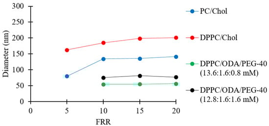 Figure 8 shows that the PC/Chol and DPPC/Chol liposomes increased from 80 to 141 nm and from 162 to 201 nm, respectively, when increasing FRR from 5 to 20. The difference in size between the two formulations may have been due to the superior fluidity of the unsaturated fatty acids in the PC double layer. It has been previously reported that an increase in fluidity results in a decrease in liposome size [65]. Moreover, it has been shown that lipids with shorter chains lead to the formation of larger liposomes [66,67], which may be due to the reduced thickness of the bilayer when a shorter chain length lipid is employed, e.g., the alkyl chain lengths of DPPC (16:0) vs. PC (18:2/16:0), leading to reduced membrane bending modulus [68] and lower line tension [69]. The resulting difference in size between PC/Chol and DPPC/Chol liposomes could have been a combination of both aforementioned effects.