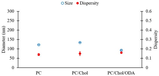 For comparison, PC, PC/Chol, and PC/ODA/Chol liposomes were evaluated, and the results are shown in Figure 9. Please refer to Table 1 (batch codes #13 PC, #20 PC, #25 PC) for the corresponding experimental conditions and lipid compositions. Figure 9 shows that the sizes of liposomes slightly changed upon addition of cholesterol to PC (diameters of 122 and 134 nm for PC and PC/Chol liposomes, respectively) likely due to an increase in the rigidity of the membrane bilayer [57], while a slight decrease in size was observed upon the incorporation of ODA (diameter of 92 nm). No significant difference was observed in the dispersity of liposomes across formulations (Figure 9).