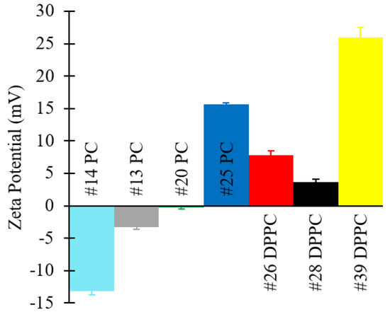 Zeta potential values of the produced liposomes (Figure 10) show that PC formulations in the absence of ODA were negatively charged, whilst DPPC liposomes were positively charged (even in the absence of ODA). Other authors have similarly reported a slightly positive value of zeta potential for DPPC liposomes, and they have attributed this to the software used to carry out the numerical calculations [71]. As expected, the addition of ODA caused a further increase in zeta potential. Coherently with our findings (Figure 8, Figure 9 and Figure 10), it was previously reported that incorporation of ODA in liposomes resulted in a slight decrease in liposome size and an increase in surface charge [23,72]. In this study, the highest zeta potential value was observed for DPPC/ODA/PEG-40 (batch code #41 DPPC) liposomes (+45.56 mV) and the lowest for PC (batch code #14 PC) liposomes (−13.16 mV).