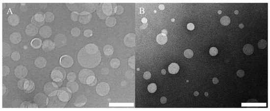 TEM images of liposome formulations of (A) PC/Chol and (B) PC/ODA/Chol. Please refer to Table 1 (batch codes #20 PC and #25 PC) for the corresponding experimental conditions and lipid compositions. Scale bars: 200 nm.