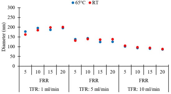 In the third set of experiments, the effect of temperature on the production of DPPC/Chol liposomes was investigated at either room temperature or 65 °C. In these experiments, the reactor was operated at varying TFRs (1, 5, and 10 mL/min) and FRRs (5, 10, 15, and 20).