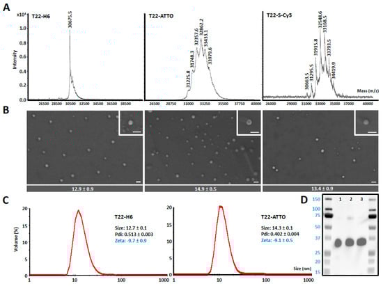 Nanoarchitecture of nanoconstructs. (A) MALDI-TOF mass spectrometry of T22-GFP-H6 (T22) nanoparticles and T22-GFP-H6-ATTO (T22-ATTO) and T22-GFP-H6-S-Cy5 (T22-S-Cy5) nanoconjugates. Each peak over 30.6 kDa (T22-GFP-H6) corresponds to the addition of a single ATTO488 or Sulfo-Cy5 molecule, respectively. (B) Representative electron microscopy (FESEM) images of the three nanoconstructs (nanoparticles and nanoconjugates) presented in two magnifications (see insets), equivalent in all images. Scale bars indicate 30 nm. At the bottom, quantitative average size of nanoconstructs is determined by image analysis and shown as mean ± standard error. (C) Volume size distribution (Size) and Z-potential (Zeta) of protein nanoparticles measured by light scattering. T22-GFP-H6-S-Cy5 sample cannot be analyzed since S-Cy5 fluorescence interferes with light scattering measurements. Pdi indicates polydispersion index. (D) Western blot analysis of T22-GFP-H6 (1), T22-GFP-H6-S-Cy5 (2) and T22-GFP-H6-ATTO (3) immunodetected by an anti-GFP monoclonal antibody.