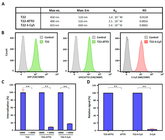 CXCR4-mediated cell internalization of nanoconstructs. (A) Biophysical properties of T22-GFP-H6 (T22), T22-GFP-H6-ATTO (T22-ATTO) and T22-GFP-H6-S-Cy5 (T22-S-Cy5) nanoparticles. (B) T22-GFP-H6 (T22) nanoparticles, and labeled T22-GFP-H6-ATTO (T22-ATTO) and T22-GFP-H6-S-Cy5 (T22-S-Cy5) nanoparticles internalization in cultured CXCR4+ Toledo cells monitored by flow cytometry upon 1 h of exposure. Grey peak overlays show control cells auto-fluorescence. 530/30BP indicates 515–545 nm bandpass filter, and 660/20BP indicates 650–670 nm bandpass filter. (C) CXCR4-mediated internalization in presence and absence of the CXCR4 specific antagonist AMD3100, upon 1 h of exposure. (D) Background fluorescence signal upon incubation of free ATTO488 (ATTO) and Sulfo-Cy5 (S-Cy5) in Toledo cells for 1 h. Fluorescence signal of free samples is shown relative to their respective nanoconjugate signals. Significant differences at p < 0.01 are indicated as **.