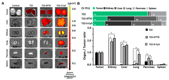 Biodistribution in subcutaneous DLBCL mouse model. (A) Images of tumor and non-target organ sections of DLBCL mouse model at 5 h upon administration of buffer (Control), T22-GFP-H6 (T22) nanoparticles or labeled T22-GFP-H6-ATTO (T22-ATTO) and T22-GFP-H6-S-Cy5 (T22-S-Cy5) nanoconjugates monitored by IVIS spectrum and displayed as pseudocolor overlay expressing radiant efficiency. T22-GFP-H6 was excited at 450–480 nm and recorded at 510–530 nm bandpass; T22-GFP-H6-ATTO was excited at 485–515 nm and monitored at 530–550 nm bandpass, and T22-GFP-H6-S-Cy5 was excited at 625–655 nm and monitored at 690–710 nm bandpass. (B) Relative tissue accumulation of nanoparticles at 5 h post-administration expressed as organ to tumor ratio. Upper horizontal bars represent percentages of total fluorescence uptake (% TFU) in different organs. All data are presented as mean ± standard error. Significant differences at p < 0.05 are indicated as *.