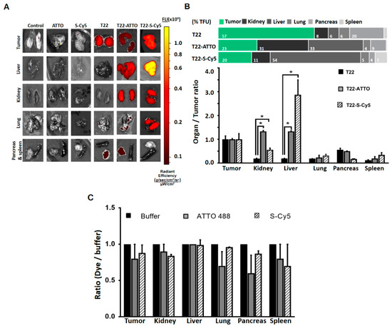 The same comparative biodistribution study was performed in an alternative M5 tumor cell line-derived subcutaneous CXCR4+ colorectal cancer mouse model in order to determine if the previously observed biodistribution changes were replicated in a completely different tumor model. Similarly, as found in the DLBCL model, the administration of the original unlabeled T22-GFP-H6 nanoparticles resulted in a high accumulation in tumor (57% ± 7% TFU) with only a moderate accumulation in pancreas at 5 h post-administration (20% ± 3% TFU). However, the administration of T22-GFP-H6-ATTO and T22-GFP-H6-S-Cy5 also resulted in a drastic reduction of tumor uptake to the range of 20% ± 8%–22.9% ± 0.8% TFU, and in a significant accumulation of labeled nanoparticles in liver (range: 32.5% ± 0.9%–54% ± 12% TFU) and kidney (range: 11% ± 0.5%–30% ± 1% TFU) (Figure 5A,B, Supplementary Table S2).